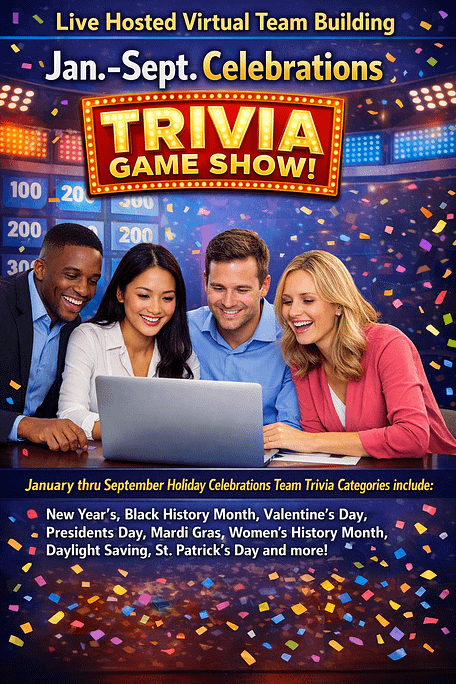 Great fun for remote happy hours as we encourage you to bring your favorite beverage to enjoy during the session. January thru September Holiday Celebrations Team Trivia Categories include: